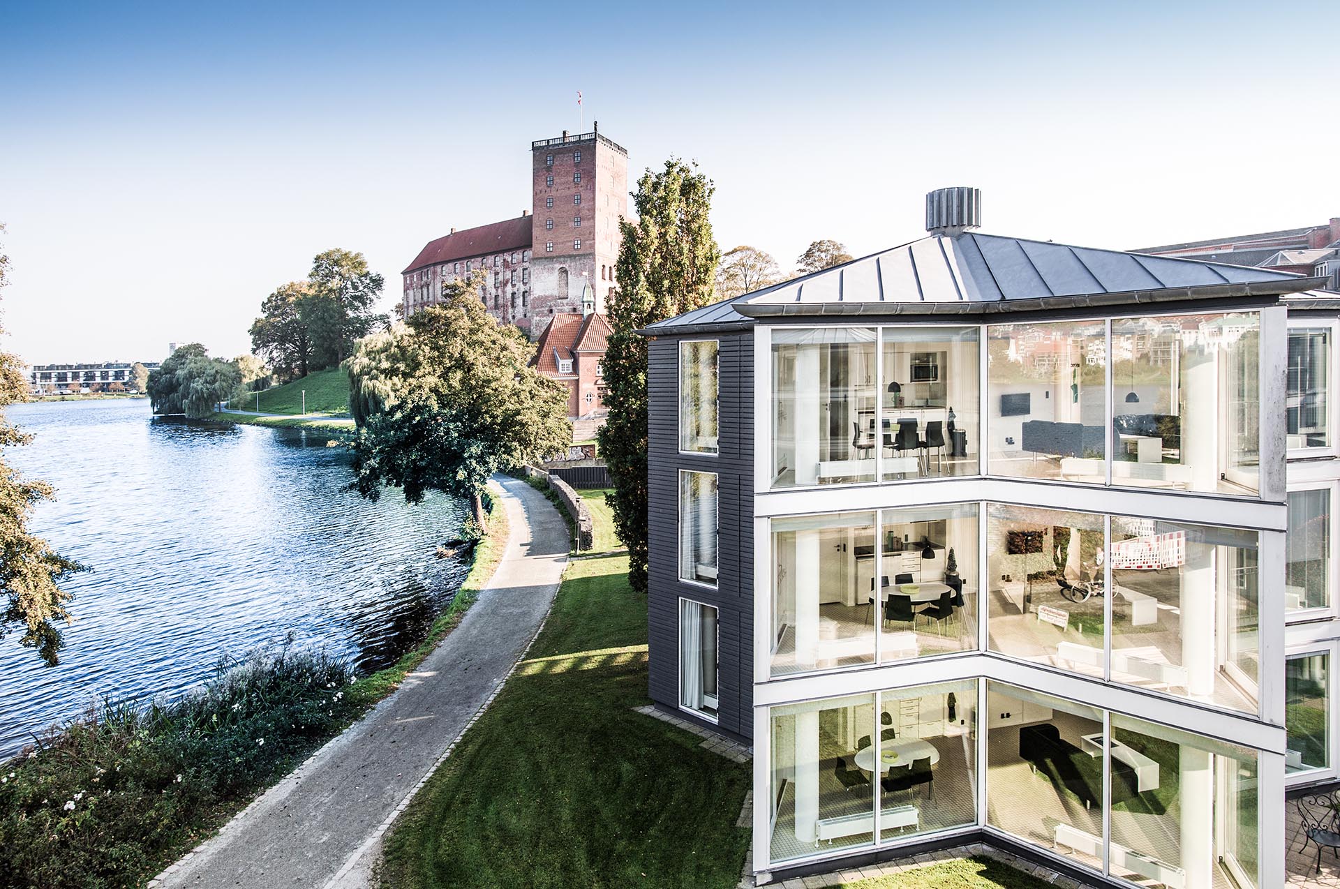 At Kolding Hotel Apartments, we offer a range of apartments which can accommodate from 1-8 persons. You can choose a view towards the street, courtyard or in the green space next to the lake. All of our apartments have at least one bedroom, a living room with kitchen and dining area, bathroom en suite and wardrobes. Every apartment is furnished with Danish design classics and stylish details. The majority of our apartments are suitable for 2, 4 or 6 occupants but we also have two penthouse apartments that accommodate up to 8 persons each.