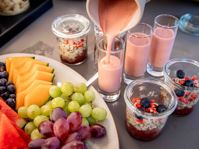In our breakfast buffet, you will find everything from chia pudding, skyr, smoothies, healthy shots, and paleo bread to pancakes, croissants, eggs, cheese, and jam. We vary our breakfast products regularly to ensure that each stay is an unique experience.